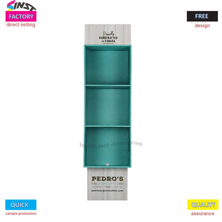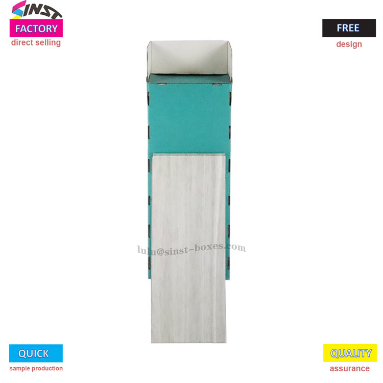 Tätä aallotettua paperitavaratelinettä käytetään pääasiassa erilaisten paperitavaroiden näyttämiseen. Runko on muodoltaan suorakaiteen muotoinen ja se on valmistettu vaaleasta puusta tai valkoisesta puun jäljitelmämateriaalista, joka näyttää raikkaalta ja teksturoituneelta. Edessä on erityisesti suunniteltu kolme avointa säilytyslokeroa, vihreän tai sinivihreän väreissä, jotka sopivat täydellisesti paperitavaroiden lajitteluun ja säilytykseen. Olipa kyseessä kirjoja, erilaisia muistivihkoja tai erilaisia kyniä, ne kaikki voidaan sijoittaa turvallisesti sisälle. Lisäksi tässä esittelytelineessä on hieman eteenpäin kalteva puolisuunnikkaan muotoinen rakenne, mikä helpottaa tavaroiden saavuttamista ja sijoittamista siihen ilman suurta vaivaa.