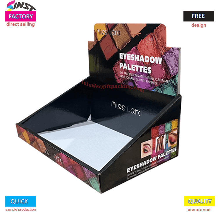 Cosmetic Makeup ja Powder Blusher työtasonäytöt ovat kustannustehokas ja ympäristöystävällinen vaihtoehto. Nämä laatikot on valmistettu kevyestä ja kestävästä aaltopahvista. Yrityksille, jotka haluavat esitellä tuotteitaan houkuttelevalla ja ammattimaisella tavalla, pahviset tiskipöydät ovat kevyitä ja ne voidaan sijoittaa tiskille tai hyllylle, joten ne sopivat täydellisesti karkkien esillepanoon. , kosmetiikkaa tai pieniä leluja ja muita pieniä tuotteita.