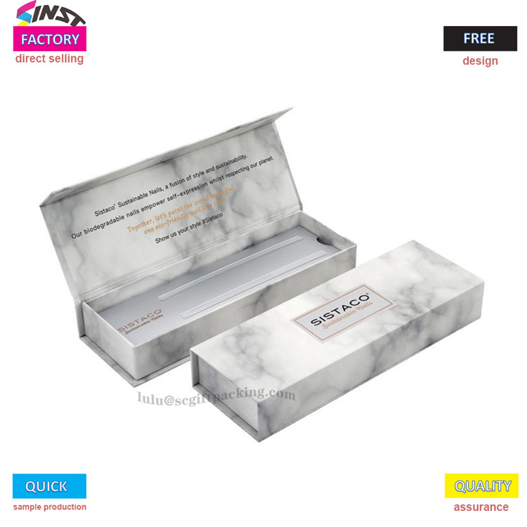 Taitettava kynsien pakkauslaatikko on valmistettu korkealaatuisista materiaaleista, ja sillä on hieno ulkonäkö. Valittavana on useita värejä ja kuvioita, jotka vastaavat eri kuluttajien henkilökohtaisia tarpeita. Laatikon rungossa on sileät viivat, se on tukeva ja kestävä, ja se voi suojata kynsituotteita tehokkaasti.