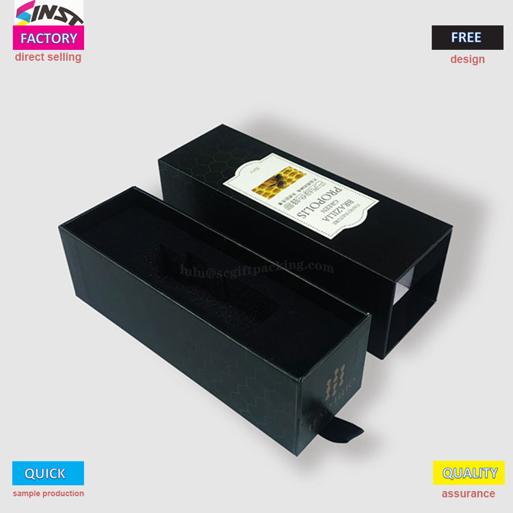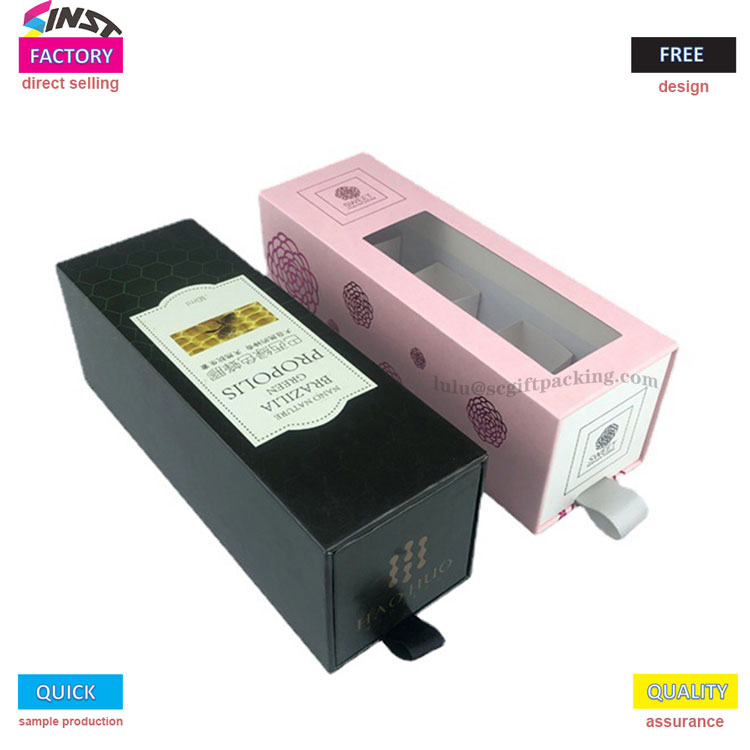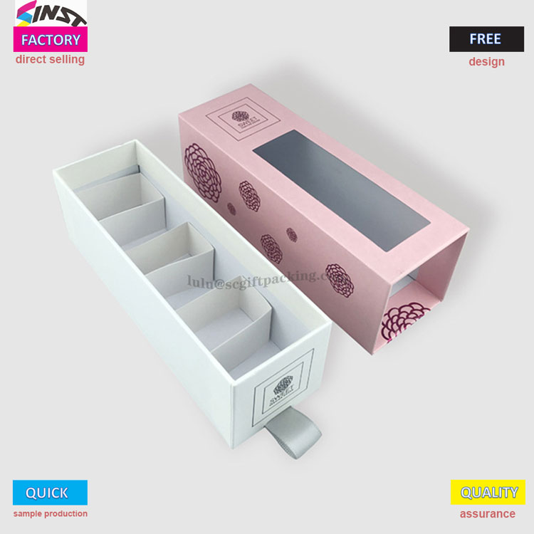 Ylellinen jäykkä laatikon liukuva lahjapakkaus eteeriselle öljylle on suunniteltu kaksiväriseksi lahjapakkaukseksi, jossa on vaaleanpunaisia ja mustia värejä törmäys yksinkertaisen ja ylellisen tunteen luomiseksi - vaaleanpunainen laatikko on koristeltu syvän violetin kukilla/violetissa kuvioissa, ja mukana tulee läpinäkyvä ikkuna suoralle sisällölle; Sisävuorissa on valkoinen jakaja ja Pull -välilehden malli, joka mahdollistaa helpon uuttamisen vain lempeällä vedolla. Korujen, kauneusnäytteiden tai 30 ml: n propolispullojen varastointiin on saatavana viisi erillistä osastoa, mikä varmistaa puhtaan ja huolestuttavan ympäristön. Voidaan käyttää kynsilakan liima -lahjapakkauksena, huulipuna lahjapakkauksena, näytteen lahjapakkaus jne.;