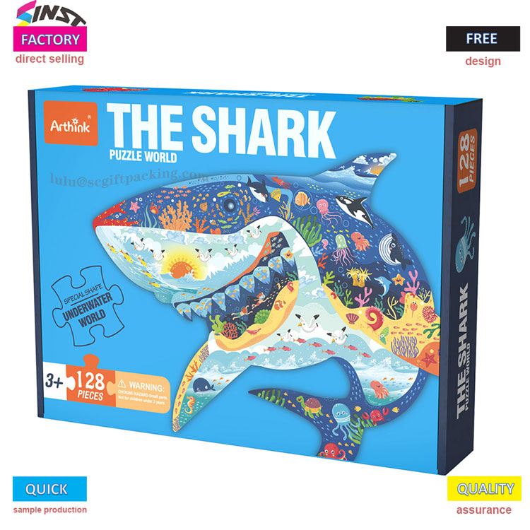 Viime viikolla tapasin Zhang Jien näyttelyhallissa. Hän piti haita kädessäänpalapeli lahjarasiahän oli juuri vastaanottanut ja huudahti iloisena: "Lapseni avasi sen ja huusi: "Äiti, katso! Suuren hain hampaat loistavat!" Hän osoitti osoittamaansa suuntaan, sinisessä lahjapakkauksessa oleva hai oli peitetty pienillä kalakoralleilla koko kehostaan, ja 128 palapelin palan kokoamisen jälkeen se näytti uivilta "vedenalainen kuninkaamme" joka on myös kuvan värikäs alien-lahjalaatikko.