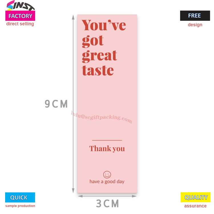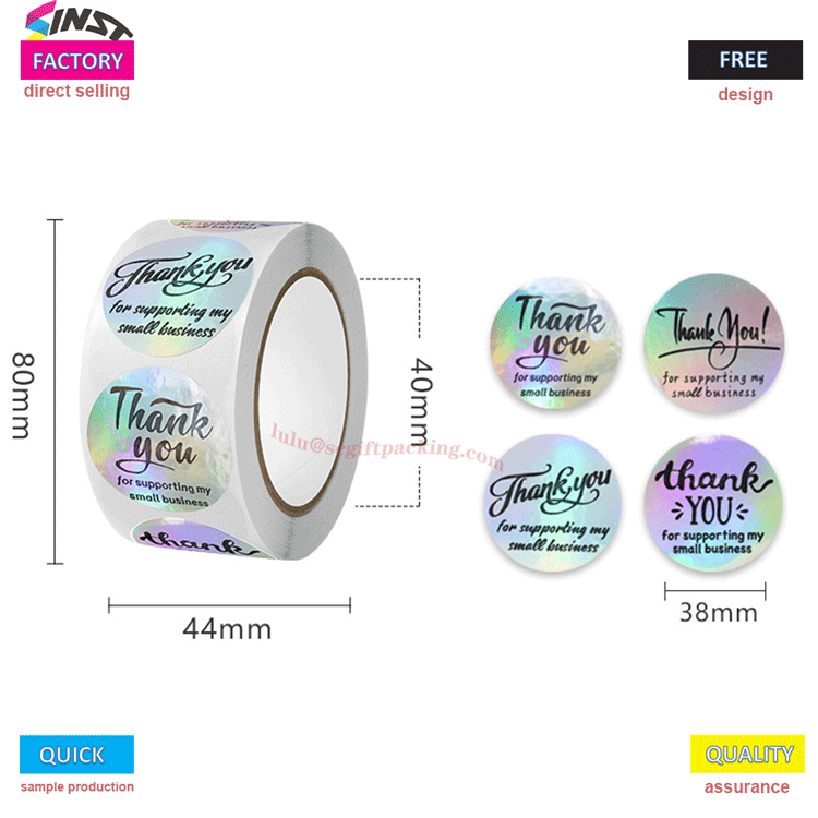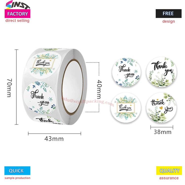 Itseliimautuva kiitossinettitarra on sinetöintitarra ja lahja-kiitostarra; Muokattavissa mihin tahansa muotoon, kokoon tai materiaaliin; Olemme vahva tehdas, jolla ei ole välittäjiä ansaitakseen hintaeroja. Yrityksemme on sitoutunut valmistamaan ja myymään erilaisia tarratarrojen materiaaleja. Tarjoamme yhden luukun palveluja suunnittelusta, levyjen valmistuksesta, painamisesta ja pakkaamisesta. Hintaalennukset;