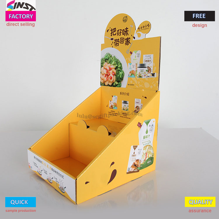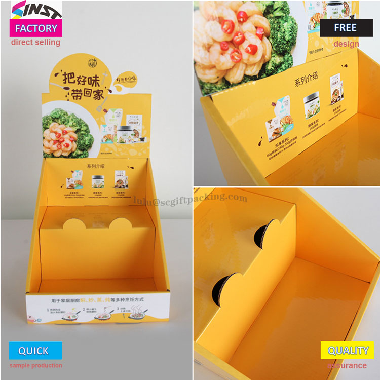 Tämä on supermarketin maustetason työtason pahvilaatikko, joka voi olla pippurin näyttölaatikko, suolanäyttölaatikko, kanan olemusnäytön ruutu jne. Se on pääasiassa kirkkaankeltainen ja siitä on tullut silmätason näytölle silmämääräinen työkalu!